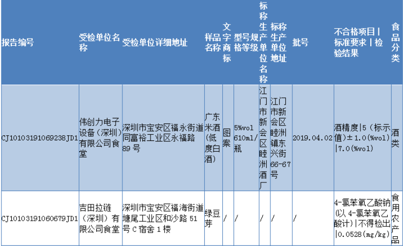 見圳客戶端 ·深圳新聞網(wǎng)2019年11月6日訊 11月5日,深圳市市場(chǎng)監(jiān)督管理局發(fā)布2019年第四十期食品安全抽樣檢驗(yàn)情況通報(bào),通報(bào)稱,深圳市市場(chǎng)監(jiān)督管理局于2019年8-9月組織對(duì)我市餐飲環(huán)節(jié)的食品開展了抽樣檢驗(yàn)工作,本次共抽檢餐飲環(huán)節(jié)食品671批次,涉及餐飲環(huán)節(jié)經(jīng)營(yíng)主體584家次,共檢測(cè)食品指標(biāo)3385項(xiàng)次。其中檢出不合格樣品12批次,涉及不合格食品類別有酒類2批次均為米酒;肉制品2批次為臘肉和臘鴨腿;食糖1批次、食用農(nóng)產(chǎn)品5批次牛蛙、豬肝等在列;蔬菜制品1批次、水產(chǎn)制品1批次。