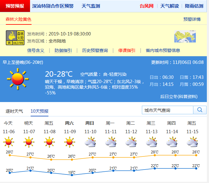 7-9日冷空氣擴散影響,北風加大、沿海及高地陣風可達7-8級,氣溫略降、干燥加??;10-12日多云間晴,空氣持續(xù)干燥,森林火險黃色預警持續(xù)生效,“深圳天氣”官方微博提醒大家繼續(xù)做好防火安全管理和宣傳工作。