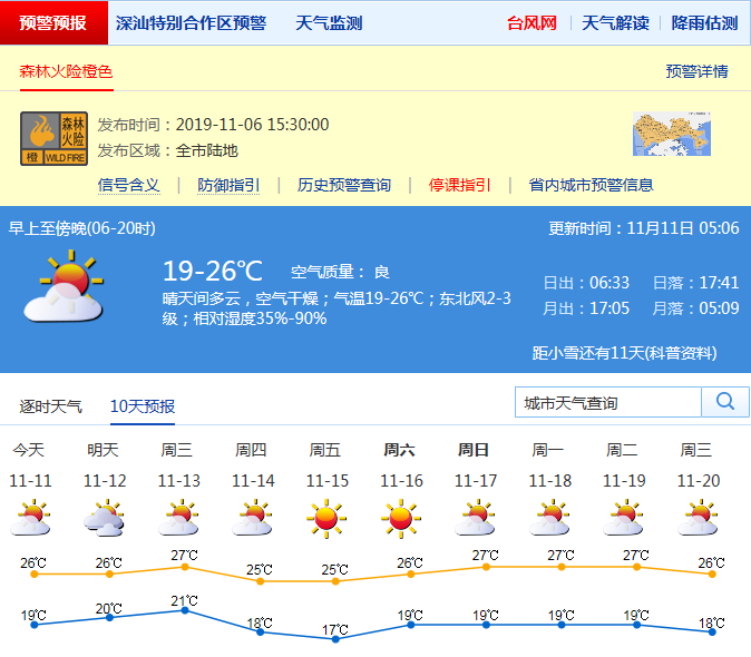 見(jiàn)圳客戶端·深圳新聞網(wǎng)2019年11月11日訊 最近鵬城天氣,終于有了一絲絲涼意,有點(diǎn)秋高氣爽的感覺(jué)了。剛剛過(guò)去的周末,全市晴天間多云,氣溫18℃-27℃。全市森林火險(xiǎn)橙色預(yù)警信號(hào)生效中。