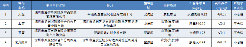 見圳客戶端·深圳新聞網2019年11月12日訊 11月11日,深圳市市場監(jiān)督管理局發(fā)布9月16日-9月20日深圳市農產品質量安全豬肉和蔬菜例行監(jiān)測結果。2019年9月16日-9月20日,深圳市市場監(jiān)督管理局在全市監(jiān)測豬肉產品53份,抽檢結果顯示全部樣品合格。抽檢蔬菜共124份,4份抽樣樣品不合格,都為農藥檢測超標。其中,深圳市海吉星國際農產品物流管理有限公司銷售的大蔥水胺硫磷超標,深圳市龍崗南聯(lián)股份合作公司黃龍?zhí)潦袌鲣N售的韭菜腐霉利超標,深圳市集貿市場有限公司惠民街市文錦分店銷售的芥藍蟲螨腈超標,深圳市鳳凰股份合作公司鳳凰綜合市場銷售的食莢豌豆多菌靈超標。