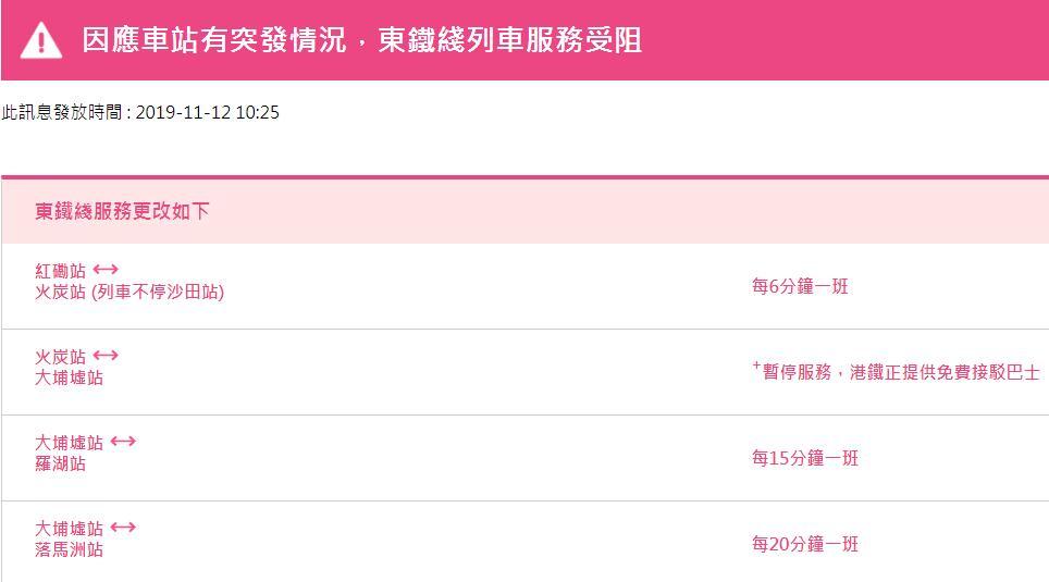 據(jù)港鐵官網(wǎng)目前最新消息,東鐵線列車運(yùn)營(yíng)服務(wù)調(diào)整為:紅磡站至火炭站每6分鐘一班;火炭站至大埔墟站暫停服務(wù);大埔墟站至羅湖站每15分鐘一班;大埔墟站至落馬洲站每20分種一班。港鐵其他線路也有多處調(diào)整。