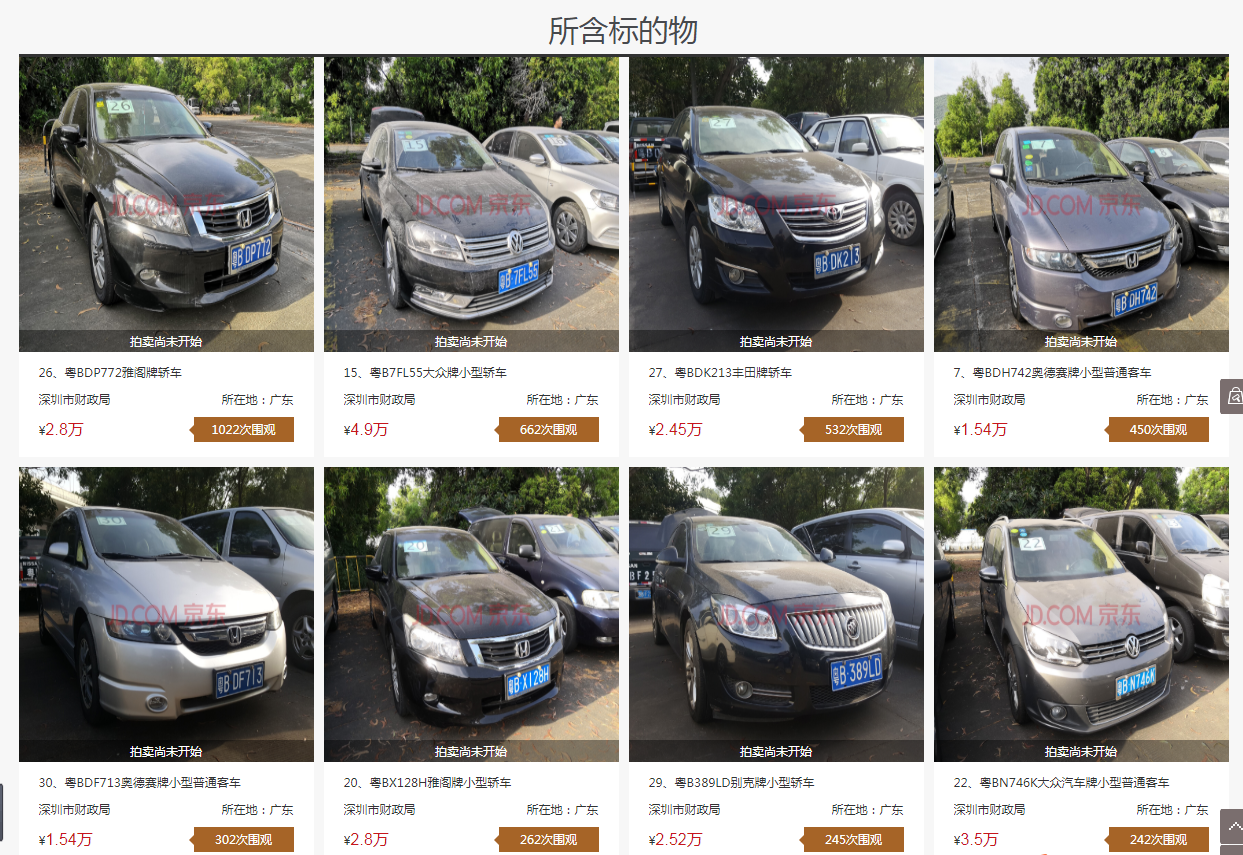 13日,晶報(bào)APP記者登錄京東網(wǎng)絡(luò)拍賣平臺(tái),已經(jīng)可以看到這批拍賣車輛的信息。其中,第二場(chǎng)標(biāo)的序號(hào)40(粵B327KW奧德賽牌小型普通客車)、標(biāo)的序號(hào)49(粵B08566豐田牌小型轎車)已撤拍。