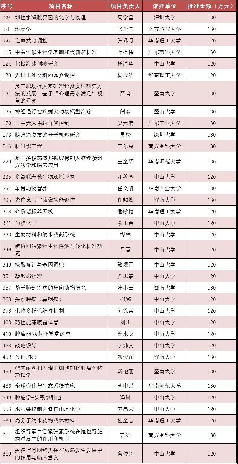 深圳大學(xué)2個,分別是:韌性水凝膠界面的化學(xué)與物理(項目負(fù)責(zé)人:周學(xué)昌);膀胱癌復(fù)發(fā)的分子機理研究(項目負(fù)責(zé)人:吳松);