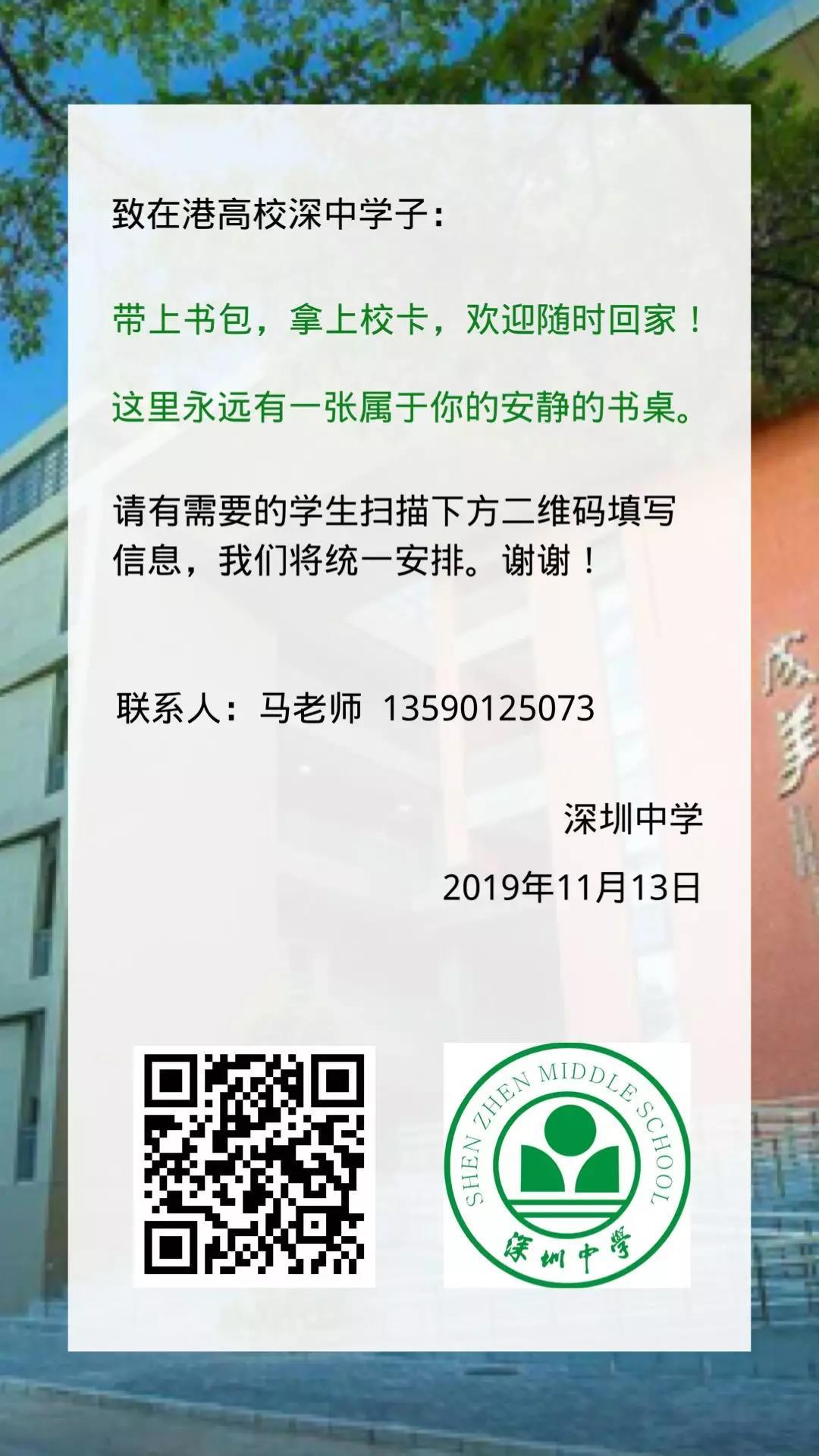 見圳客戶端·深圳新聞網(wǎng)2019年11月14日訊 繼香港中文大學(xué)(深圳)發(fā)文表示為內(nèi)地在港就讀學(xué)生提供臨時(shí)免費(fèi)住宿后,深圳中學(xué)今天也在官方微信公號中致信在港高校深中學(xué)子,只要拿上校園卡,深中隨時(shí)歡迎學(xué)子們回家!學(xué)校將對有需要的學(xué)生統(tǒng)一進(jìn)行安排。