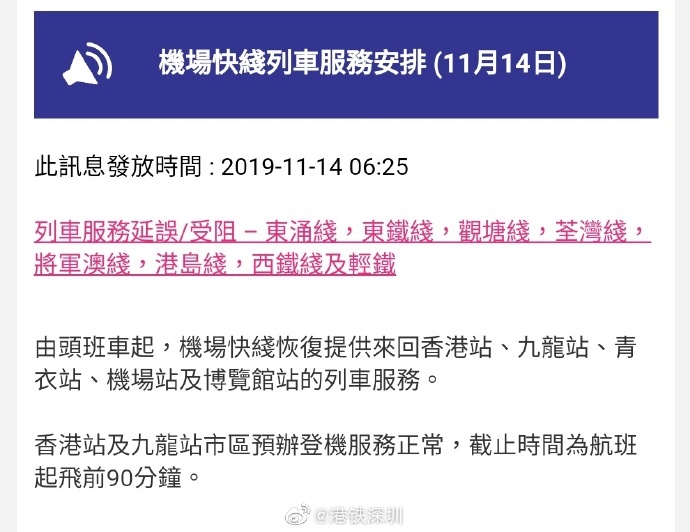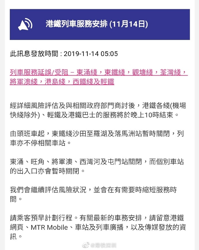 據(jù)港鐵官網(wǎng)目前最新消息,11月14日,港鐵各線(機場快線除外)、輕鐵及港鐵巴士的服務將于晚上10時結(jié)束,東涌線、東鐵線、觀塘線、荃灣線、將軍澳線、港島線、西鐵線及輕鐵列車服務延誤/受阻。