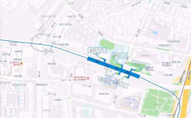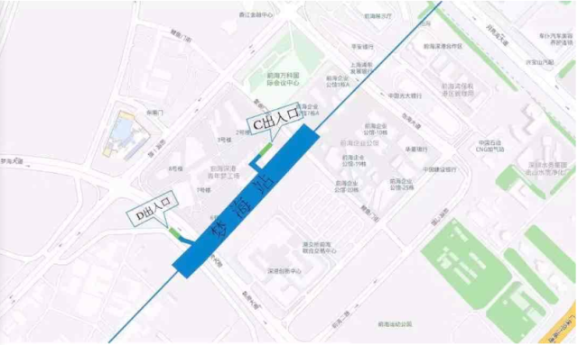 怡海站位于怡海大道與月亮灣大道中間,車站出入口共計(jì)4個(gè),B、D出入口預(yù)留,A出入口接光大銀行,連接怡海大道,C出入口前海展廳旁,連接A號(hào)公路