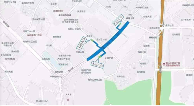 深大南站位于學(xué)府路與白石路交界處北側(cè),車站出入口共計(jì)4個(gè):A1出入口、A2出入口、A3出入口、B出入口,其中A1出入口位于深圳大學(xué)基礎(chǔ)實(shí)驗(yàn)樓一期南側(cè),B出入口位于深圳大學(xué)基礎(chǔ)實(shí)驗(yàn)樓一期西側(cè)