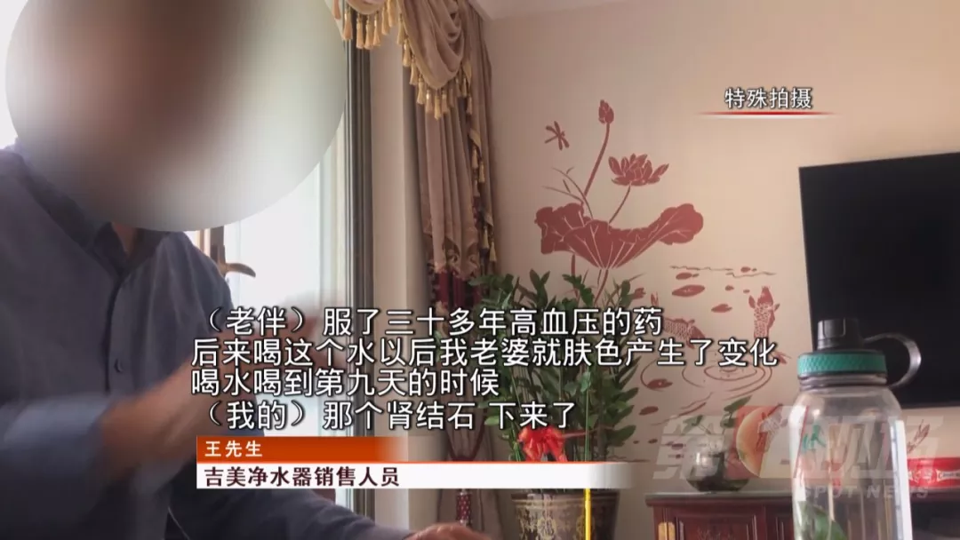 執(zhí)法人員來到客廳,盡管王先生的兒子矢口否認家里在賣凈水器,但桌子上擺放著宣傳單頁,王先生正在推銷凈水器,一切都說明了問題。隨后王先生帶執(zhí)法人員來到廚房,繼續(xù)展示凈水器的療效。王先生的老伴兒說,除了他們自家喝磁化水,親戚們也都在他的推薦下使用這款凈水器。