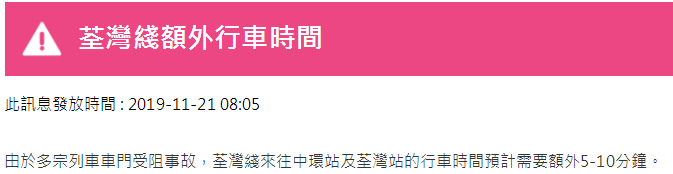 此外,目前,由于列車(chē)車(chē)門(mén)受阻,乘客求助等多宗事故,港島線來(lái)往堅(jiān)尼地城站及柴灣站、荃灣線來(lái)往中環(huán)站及荃灣站、觀塘線來(lái)往黃埔站及調(diào)景嶺站,行車(chē)時(shí)間預(yù)計(jì)需要額外10至15分鐘。