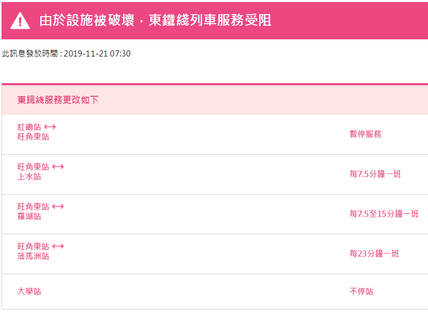 今日,東鐵線提供羅湖站、落馬洲站服務(wù),但行車(chē)時(shí)間較長(zhǎng),旺角東站至羅湖站每7.5至15分鐘一班,旺角東站至落馬洲每23分鐘一班,紅磡站至旺角東站暫停服務(wù)。西鐵線紅磡站至尖角東站暫停服務(wù)。