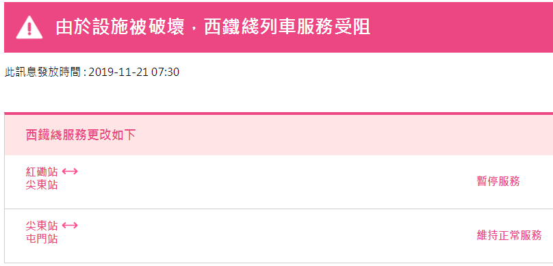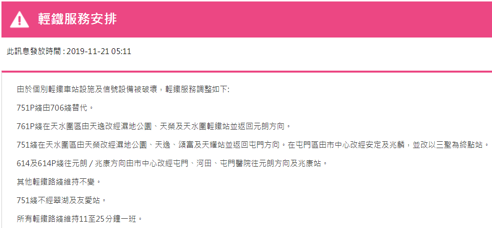 據(jù)港鐵消息,11月21日,香港地鐵各線(機(jī)場(chǎng)快線除外)、輕鐵及港鐵巴士的服務(wù)將于晚上11時(shí)結(jié)束。西鐵線/東鐵線紅磡站及大學(xué)站繼續(xù)關(guān)閉。需要注意的是,元朗站將于下午2時(shí)關(guān)閉,列車(chē)不停元朗站,此外,個(gè)別車(chē)站出入口會(huì)暫時(shí)關(guān)閉。