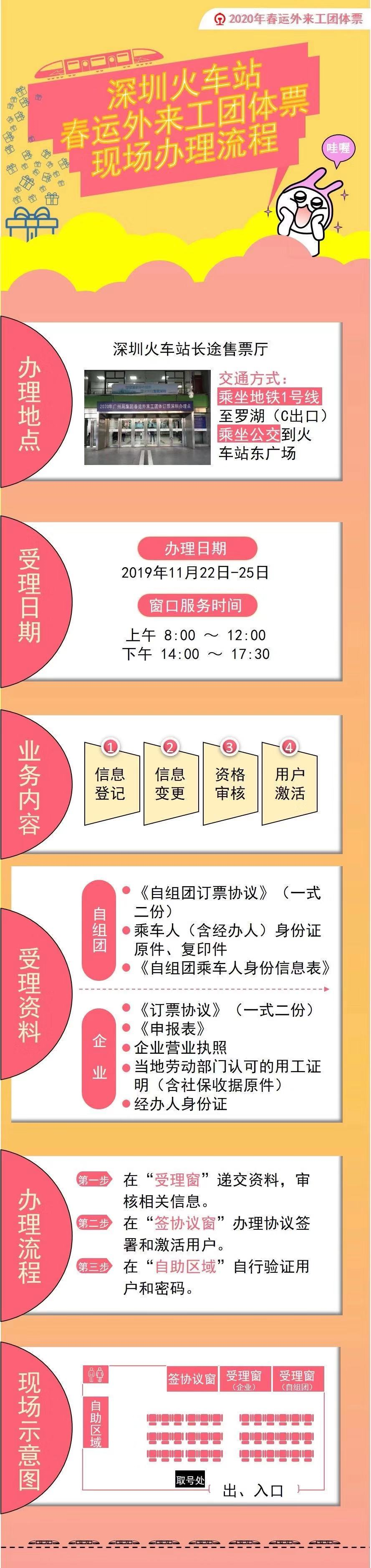 深圳特區(qū)報(bào)2019年11月22日訊 記者從深圳火車(chē)站獲悉,2019年11月22日—25日期間,訂票企業(yè)(自組團(tuán))可到深圳火車(chē)站集中辦理新企業(yè)(自組團(tuán))登記、老企業(yè)(自組團(tuán))信息變更、自組團(tuán)身份信息提交、資格審核、用戶(hù)激活等一條龍業(yè)務(wù),詳情請(qǐng)看下圖↓↓↓