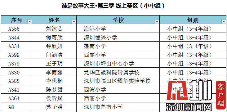 附:“誰是故事大王·第三季”-線上賽區(qū)晉級深圳市復(fù)賽名單