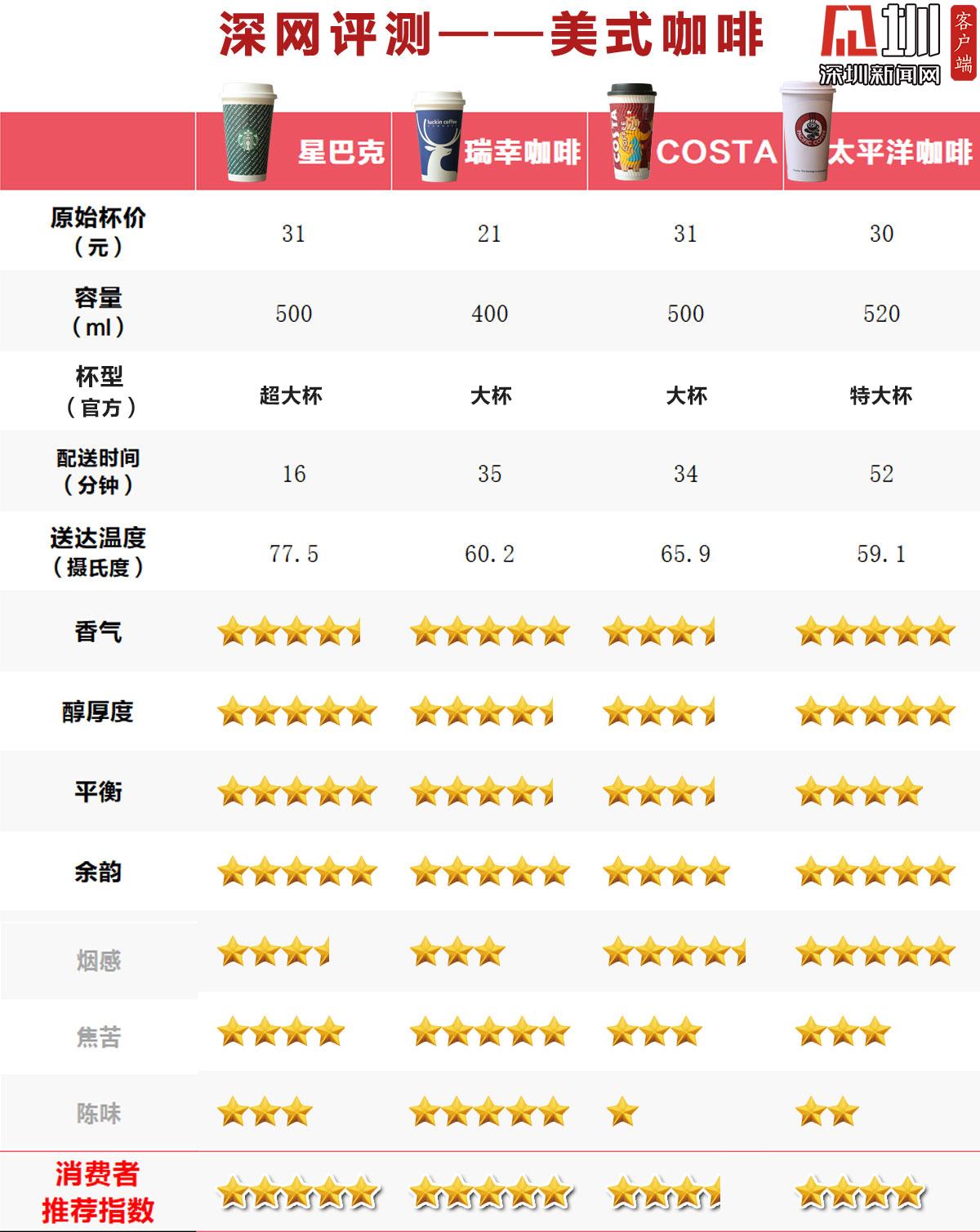 星巴克、瑞幸、太平洋星級(jí)較高,,Costa陳味較重僅獲三星半