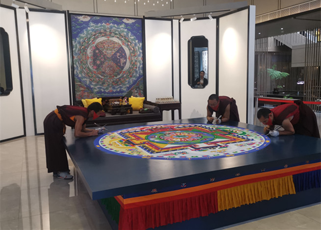 在活動(dòng)現(xiàn)場(chǎng),壇城沙畫(huà)的現(xiàn)場(chǎng)制作格外引人注目?!耙簧骋皇澜?,一葉一菩提”——壇城沙畫(huà)的過(guò)程仿佛一場(chǎng)視覺(jué)的盛宴。據(jù)了解,壇城是指對(duì)一座宮殿一個(gè)世界的泛義,用珍貴珊瑚、瑪瑙、綠松石等礦物質(zhì)研磨成粉,落沙即成畫(huà),畫(huà)面立體生動(dòng),壇城展示了高度的藝術(shù)魅力和視覺(jué)觀感。