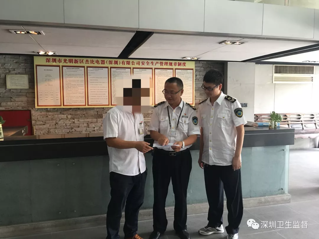 今年6月,光明區(qū)衛(wèi)生監(jiān)督所衛(wèi)生監(jiān)督員對位于轄區(qū)內(nèi)的杰比電器(深圳)有限公司進(jìn)行日常監(jiān)督檢查。