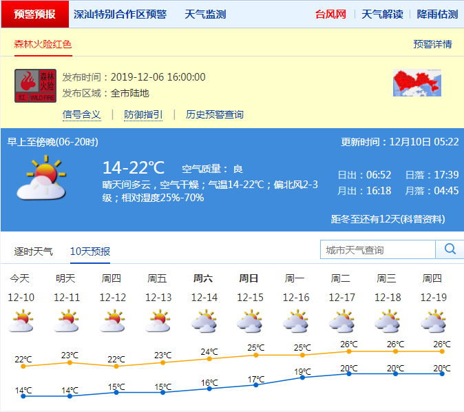 見圳客戶端·深圳新聞網(wǎng)2019年12月10日訊 今日深圳晴天間多云,空氣干燥;氣溫14-22℃;偏北風(fēng)2-3級(jí);相對濕度25%-70%。