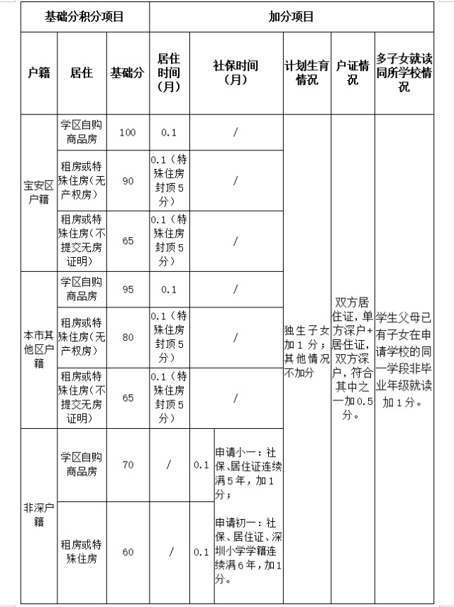 (1)其中申請小一的,父母一方持有深圳居住證、累計繳納社保(養(yǎng)老保險和醫(yī)療保險同時繳納)年限滿5年及以上的非深戶籍人員子女,加1分。