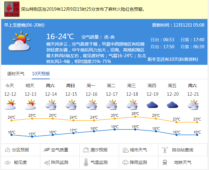 見圳客戶端·深圳新聞網2019年12月12日訊 12日深圳晴天間多云,空氣極度干燥,早晨中西部地區(qū)有輕微到輕度灰霾,中午前后風力加大,沿海、高地和海區(qū)最大陣風6級左右,能見度好轉;氣溫16-24℃。