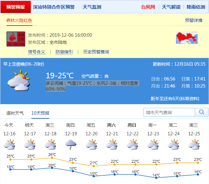 見圳客戶端·深圳新聞網(wǎng)2019年12月16日訊 今日深圳多云間晴;氣溫19-25℃;東風2-3級;相對濕度60%-90%