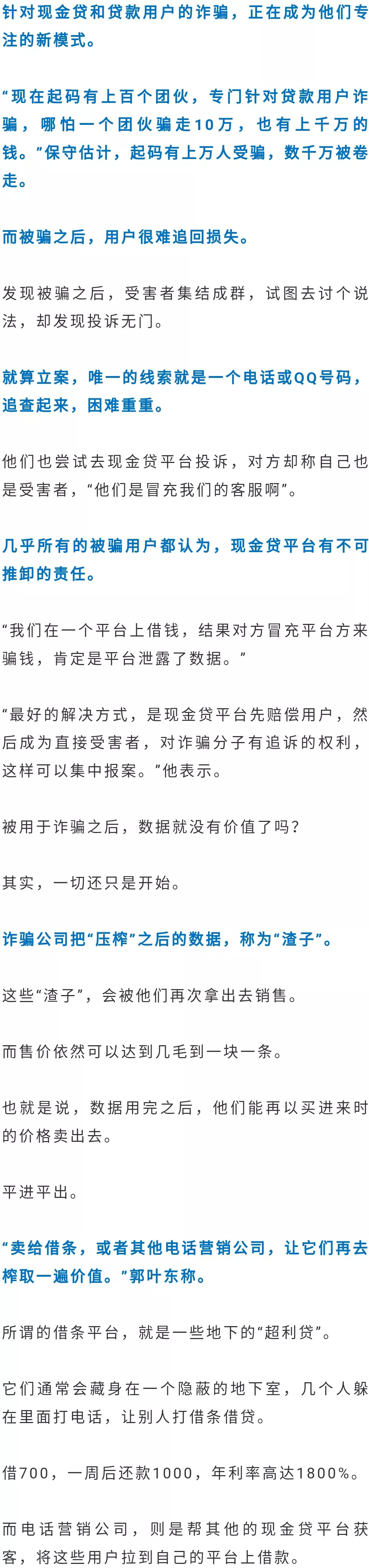 在2017年監(jiān)管收緊后,很多不正規(guī)的小現(xiàn)金貸公司,業(yè)務(wù)難以為繼,就開始干起銷售數(shù)據(jù)的生意。