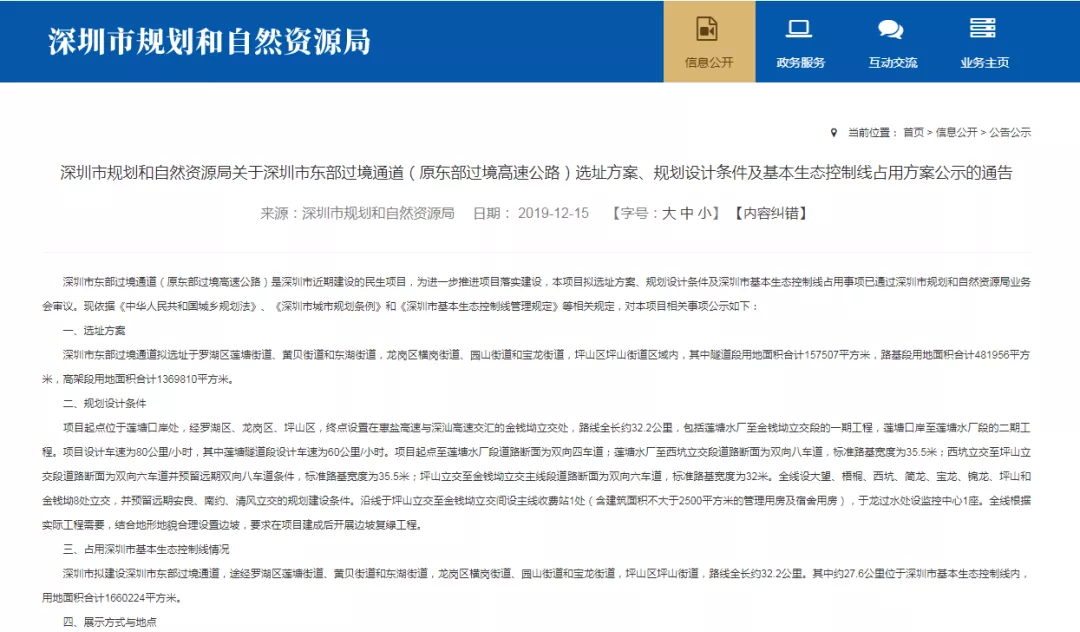 深圳發(fā)布2019年12月23日訊 @深圳的小伙伴們,大家伙關(guān)心的交通利好來了!深圳東部過境通道(原東部過境高速公路)選址方案出啦,快來看看有沒有經(jīng)過你家附近!