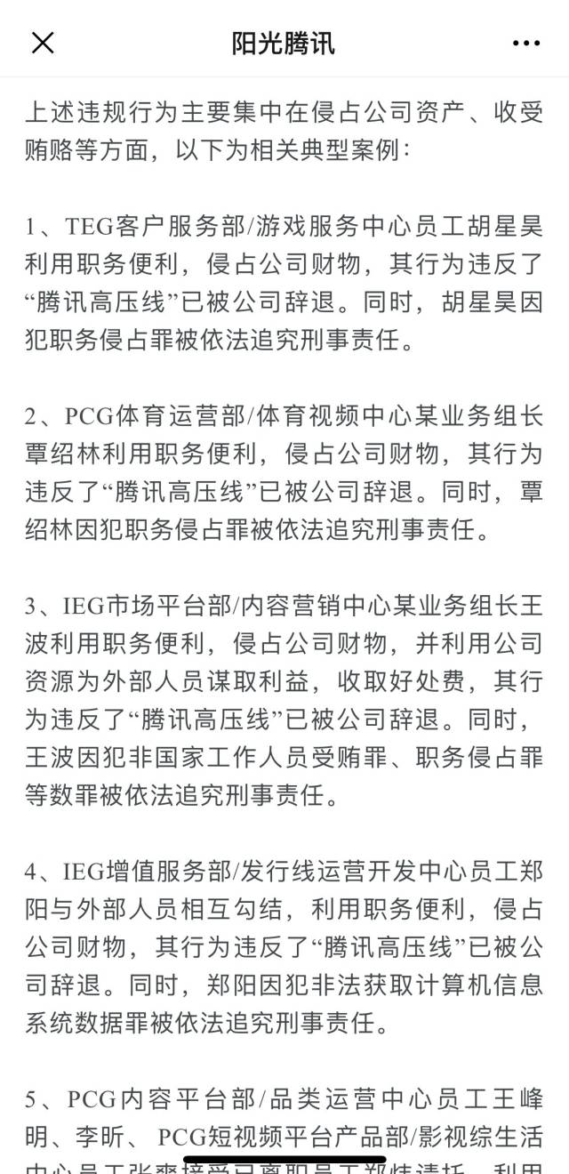 2、PCG體育運(yùn)營部/體育視頻中心某業(yè)務(wù)組長(zhǎng)覃紹林利用職務(wù)便利,侵占公司財(cái)物,其行為違反了“騰訊高壓線”已被公司辭退。同時(shí),覃紹林因犯職務(wù)侵占罪被依法追究刑事責(zé)任。
