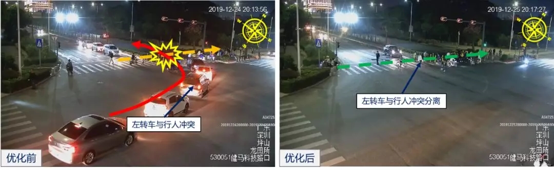 優(yōu)化改善后,路口夜間周期由102秒下降至87秒,路口空放明顯減少;人、車交叉沖突點(diǎn)數(shù)由2個減少至0個,基本實(shí)現(xiàn)人車獨(dú)立通行路權(quán),行人過街安全得以保障。