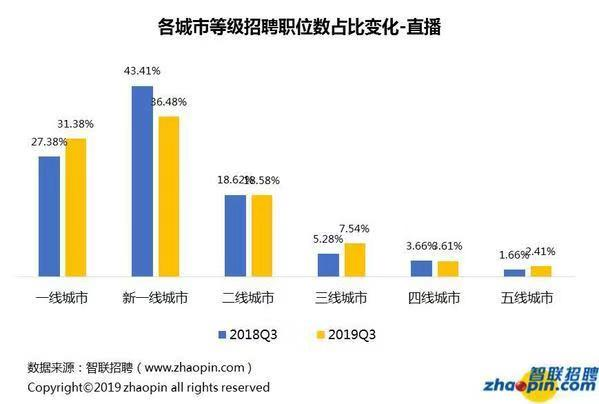 從趨勢上看,短視頻機構(gòu)隨著用戶的下沉也在下沉,而直播領域呈現(xiàn)進一步向一線城市聚集的趨勢。2019年三季度,短視頻行業(yè)在一線城市的招聘需求占比較去年同期下降了7.21個百分點,新一線、二線、三線等比例均有提高;直播行業(yè)在一線城市的招聘需求占比則是提高了4個百分點。(記者 莊瑞玉)
