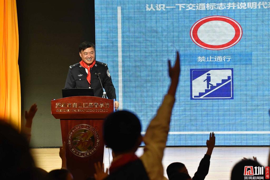 2019年2月20日,南山區(qū)荔香學(xué)校,市交警局局長(zhǎng)徐煒正在向?qū)W生們講述交通安全知識(shí)。為加強(qiáng)2019年度新學(xué)期校園交通安全宣傳工作,深圳交警聯(lián)合市教育局在新學(xué)期開(kāi)學(xué)期間,在全市范圍開(kāi)展“交通安全教育第一課”授課活動(dòng)。