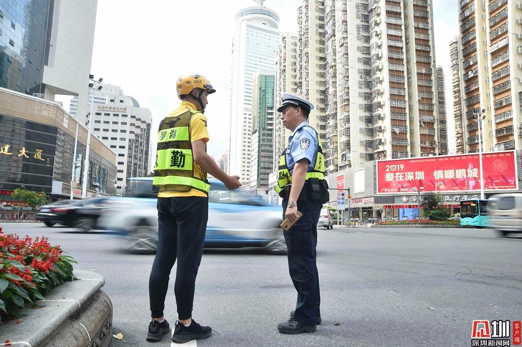 2019年4月23日,深南東路,深圳交警開(kāi)展和外賣(mài)小哥角色互換的活動(dòng),美團(tuán)外賣(mài)小哥趙春曉正在路口執(zhí)勤。