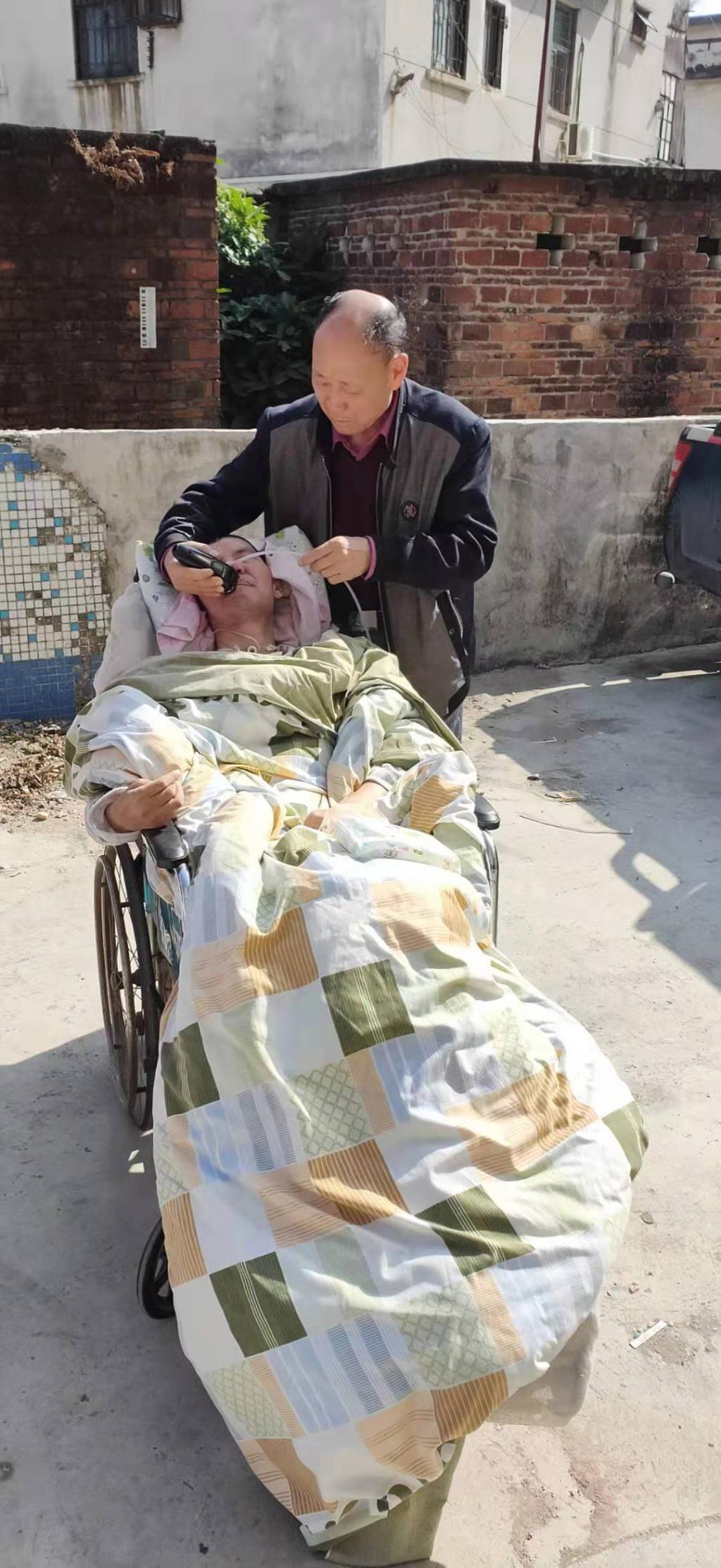 今年1月3日中午,大晴天,劉林把女婿劉建榮從床上背起,小心翼翼地轉(zhuǎn)移到輪椅上。一遇上好天氣,他準(zhǔn)會(huì)帶女婿出門曬曬太陽。劉林今年68歲,體力大不如前,把一個(gè)植物人背下床對他來講并不容易。"盡管再累也要堅(jiān)持。"劉林說。