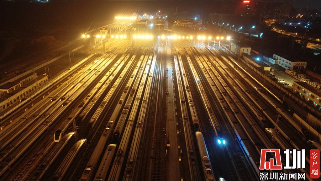 1月15日凌晨,深圳動車運(yùn)用所內(nèi)的存車庫航拍畫面。