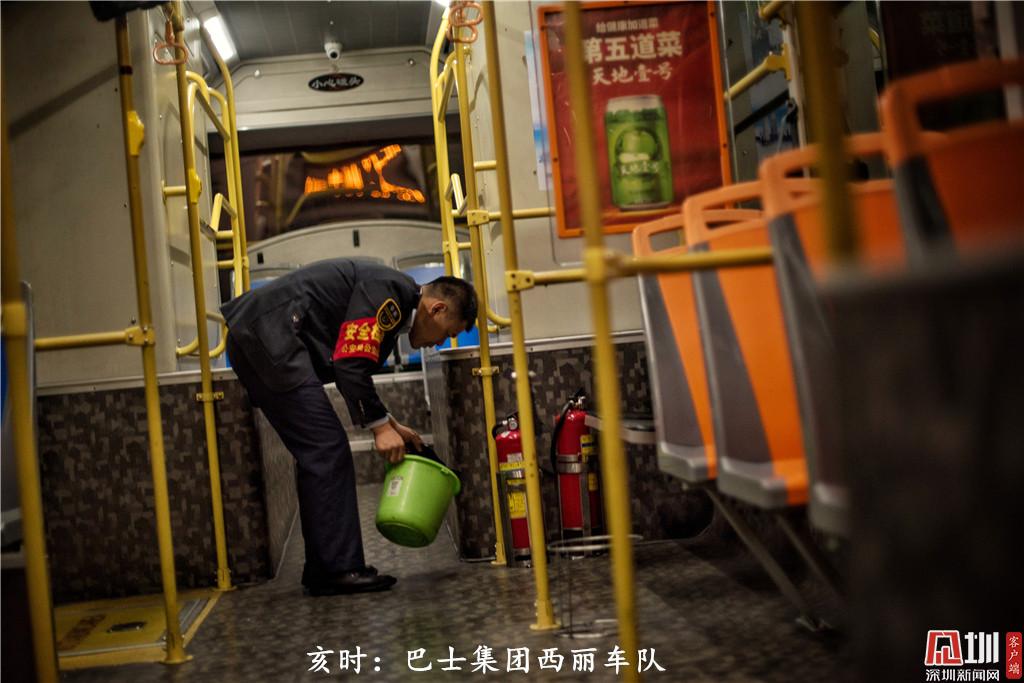 亥時:22點50分左右,深圳巴士集團四分公司西麗車隊駕駛員張華林收班后,在給他的“老搭檔”進行衛(wèi)生清潔,第二天,他和他的搭檔又將上路,為市民服務(wù)。