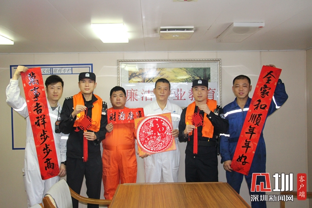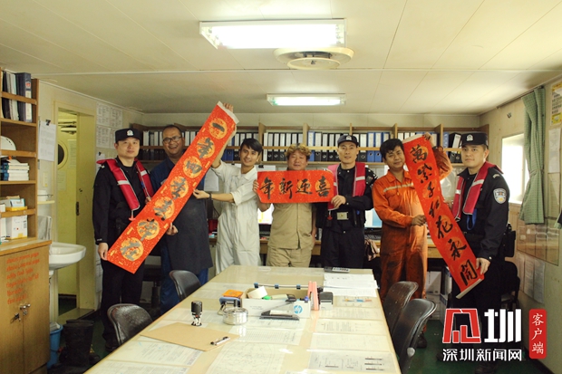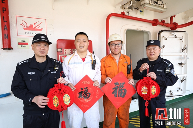 鹽田邊檢站登輪送春聯(lián)、燈籠,將中國(guó)年送上國(guó)際船舶。
