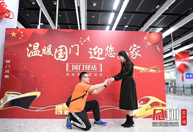 1月20日,西九龍邊檢站“國(guó)門(mén)驛站”展板前,在邊檢民警的掌聲和祝福中,旅客官先生鄭重向女友宋女士求婚,有情人終成眷屬,“在國(guó)門(mén)求婚,把愛(ài)人帶回家門(mén)”成為一段佳話。為營(yíng)造溫馨喜慶的春節(jié)氛圍,該站在口岸設(shè)置主題活動(dòng)展板,懸掛節(jié)日裝飾,還研發(fā)小程序,在驗(yàn)證臺(tái)一體機(jī)向旅客展示主題海報(bào),令人耳目一新。
