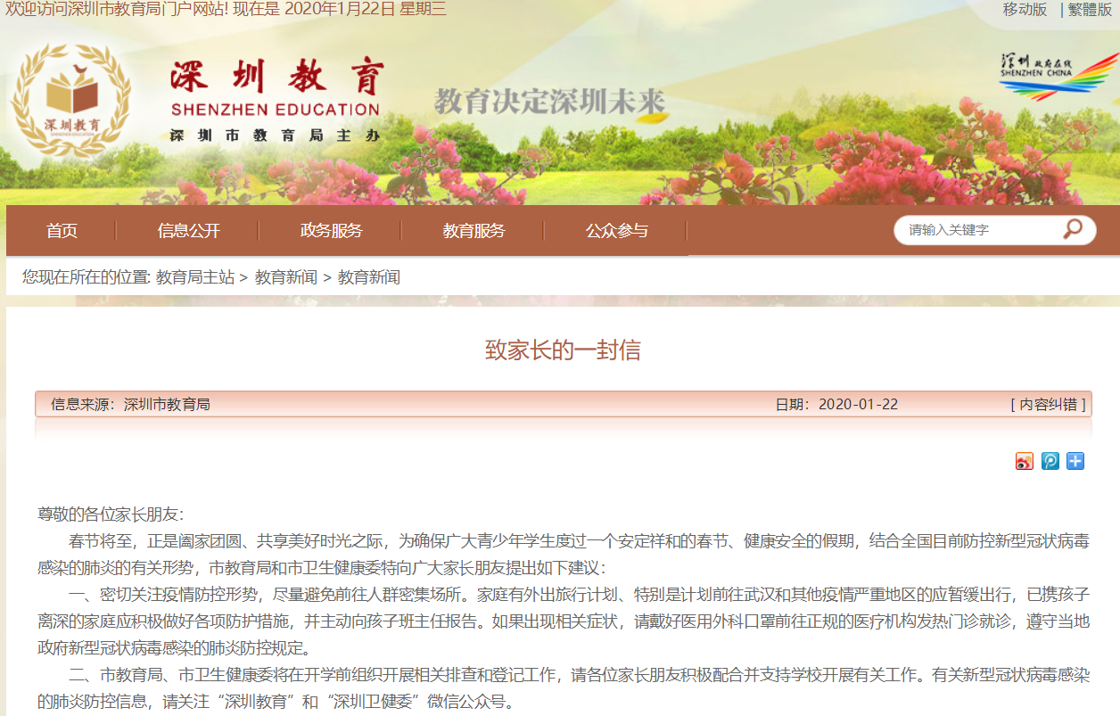 見(jiàn)圳客戶端·深圳新聞網(wǎng)2020年1月22日訊 1月22日,市教育局下發(fā)《深圳市教育系統(tǒng)新型冠狀病毒感染的肺炎疫情防控工作方案》的通知,引導(dǎo)師生假期盡量不要前往武漢和疫情嚴(yán)重地區(qū),并要求校外培訓(xùn)機(jī)構(gòu)即日起全面停止春節(jié)假期補(bǔ)課。