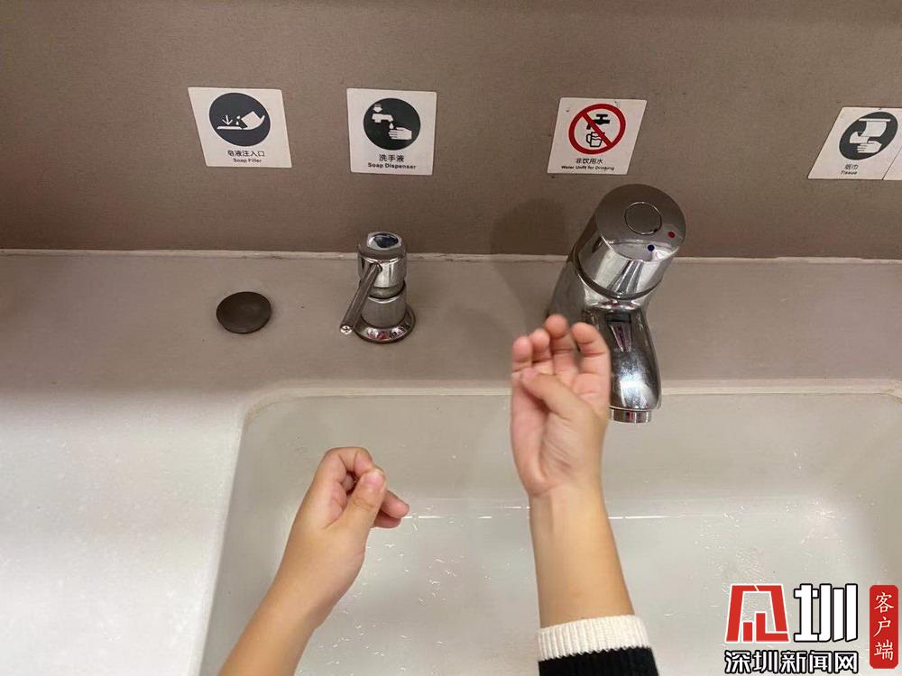我好像聽見我的肚子開始叫了,媽媽讓我先洗手才能吃東西。洗手池這里有洗手液和一次性擦手紙,水都是溫的,洗手的時候很舒服。見圳客戶端、深圳新聞網記者 劉婷 攝