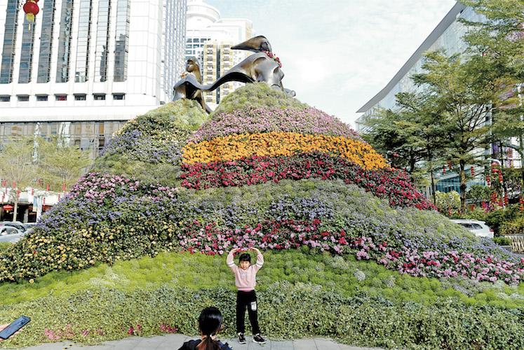▲國(guó)貿(mào)廣場(chǎng)前"愛(ài)神永駐"花塑。