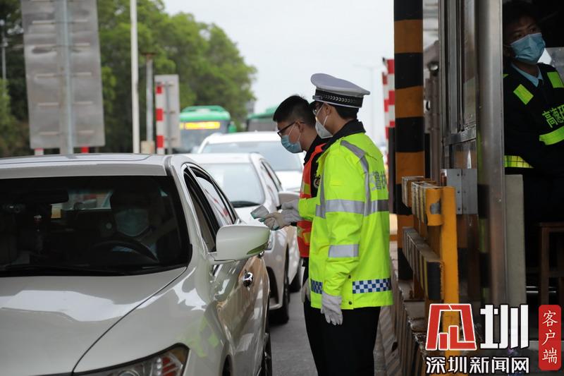 26日下午深圳黃鶴收費(fèi)站,深圳交警對(duì)往來司機(jī)進(jìn)行體溫檢測(cè)。