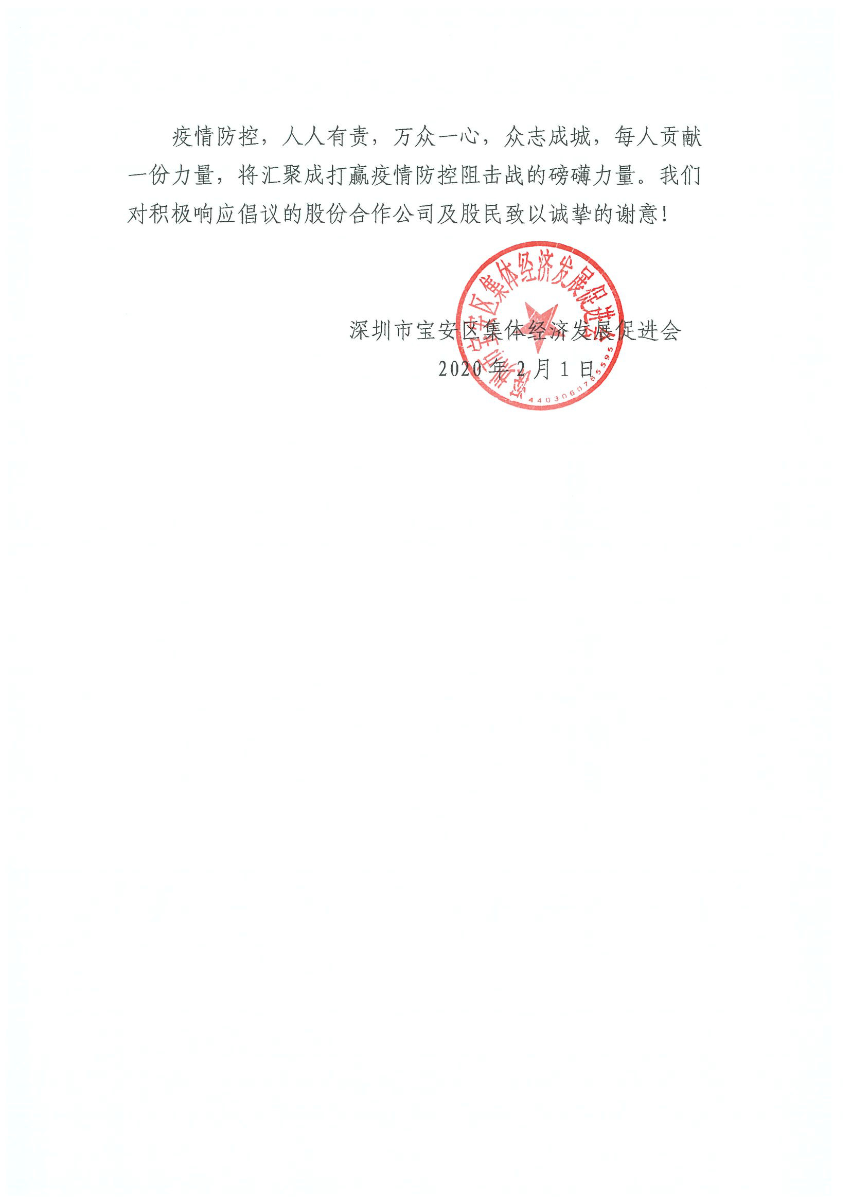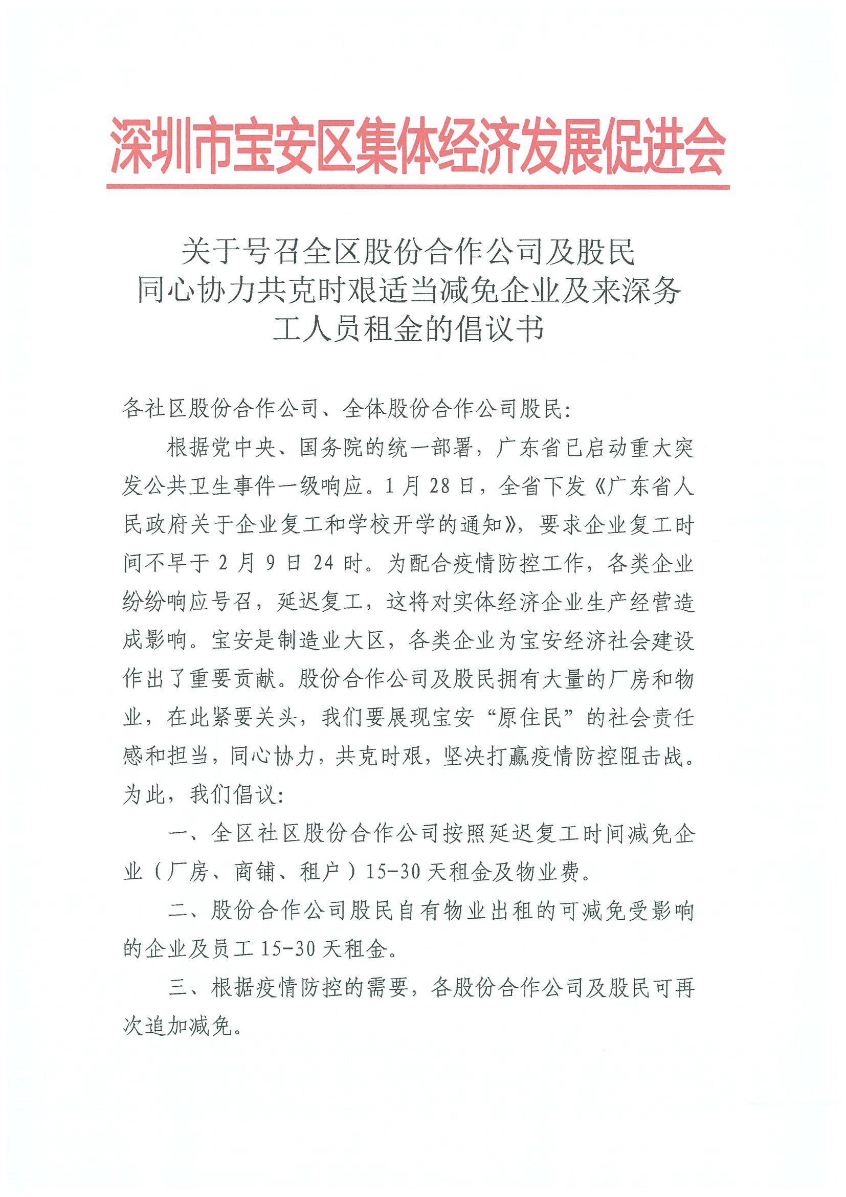 深圳新聞網(wǎng)寶安訊 “疫情防控,人人有責(zé),萬(wàn)眾一心,眾志成城,每人貢獻(xiàn)一份力量,將匯聚成打贏疫情防控阻擊戰(zhàn)的磅礴力量?!?月1日晚,寶安區(qū)集體資產(chǎn)管理局指導(dǎo)寶安區(qū)集體經(jīng)濟(jì)發(fā)展促進(jìn)會(huì)向?qū)毎矃^(qū)各社區(qū)股份合作公司、全體股份合作公司股民發(fā)出《同心協(xié)力共克時(shí)艱適當(dāng)減免企業(yè)及來(lái)深務(wù)工人員租金的倡議書(shū)》,號(hào)召全區(qū)股份合作公司及股民適當(dāng)減免企業(yè)及來(lái)深務(wù)工人員15-30天租金及物業(yè)費(fèi),并根據(jù)疫情防控的需要可再次追加減免。