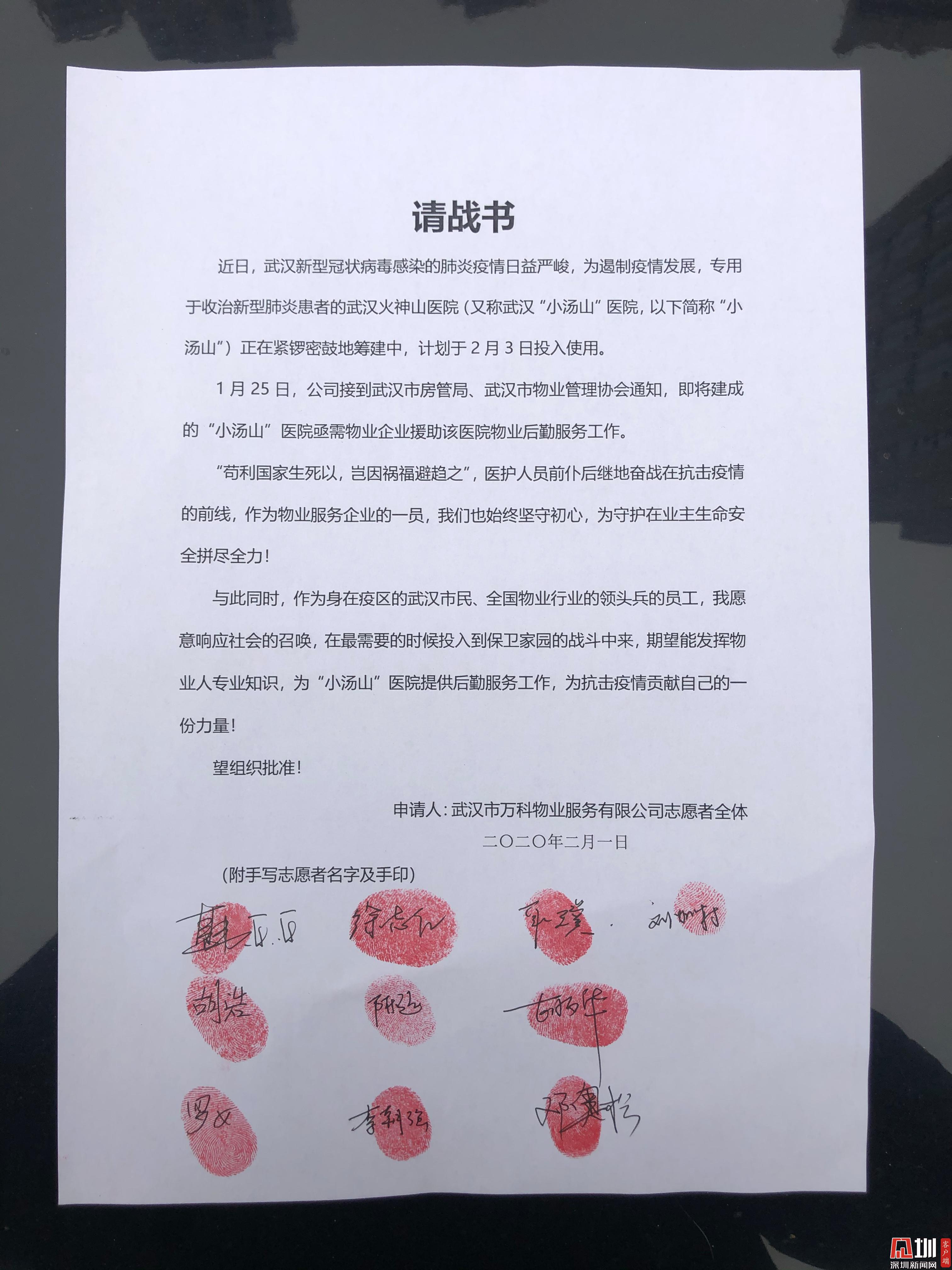 深圳新聞網(wǎng)訊(見(jiàn)圳客戶端、深圳新聞網(wǎng)記者 王志明)2月1日下午,萬(wàn)科物業(yè)支援武漢火神山醫(yī)院的首批10名志愿者在蔡甸區(qū)中核酒店集合,他們即將踏上前往火神山醫(yī)院的接駁車,連夜開(kāi)展火神山醫(yī)院的保潔開(kāi)荒工作,以保障火神山醫(yī)院在2月2日晚上交付投用,2月3日正式收治病人。