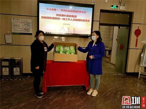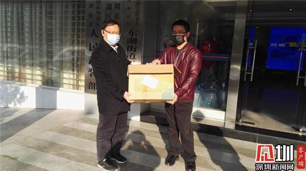 ▲黃志?。ㄓ遥┵浰土?00只醫(yī)用口罩支援東湖街道防控一線。