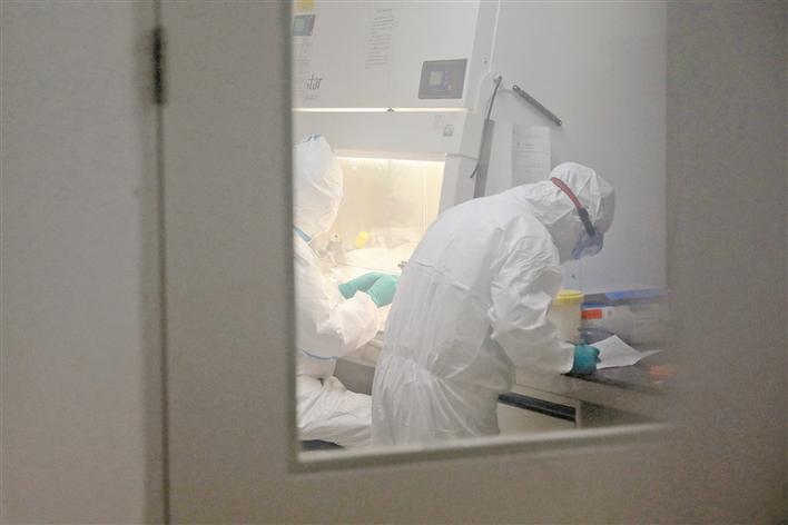 每次走進(jìn)實(shí)驗(yàn)室之前,武偉華都要穿好厚厚的防護(hù)服,從頭到腳全副武裝。打開那扇通往實(shí)驗(yàn)室的厚重大門,燈光在白色的墻壁上反射出冷冷的光,一直照到長長的走廊盡頭。走入實(shí)驗(yàn)室前,所有的技術(shù)人員還要經(jīng)過一個(gè)緩沖區(qū),這個(gè)區(qū)域每天要經(jīng)過數(shù)次化學(xué)消毒和紫外線消毒,保證致命病毒無法彌散。每結(jié)束一組檢測,檢測人員還要再經(jīng)歷一次全面消毒,如此往復(fù)。