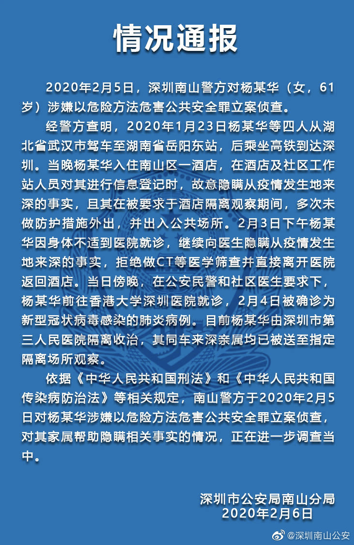 依據(jù)《中華人民共和國刑法》和《中華人民共和國傳染病防治法》等相關(guān)規(guī)定,南山警方于2020年2月5日對楊某華涉嫌以危險方法危害公共安全罪立案偵查,對其家屬幫助隱瞞相關(guān)事實的情況,正在進(jìn)一步調(diào)查中。