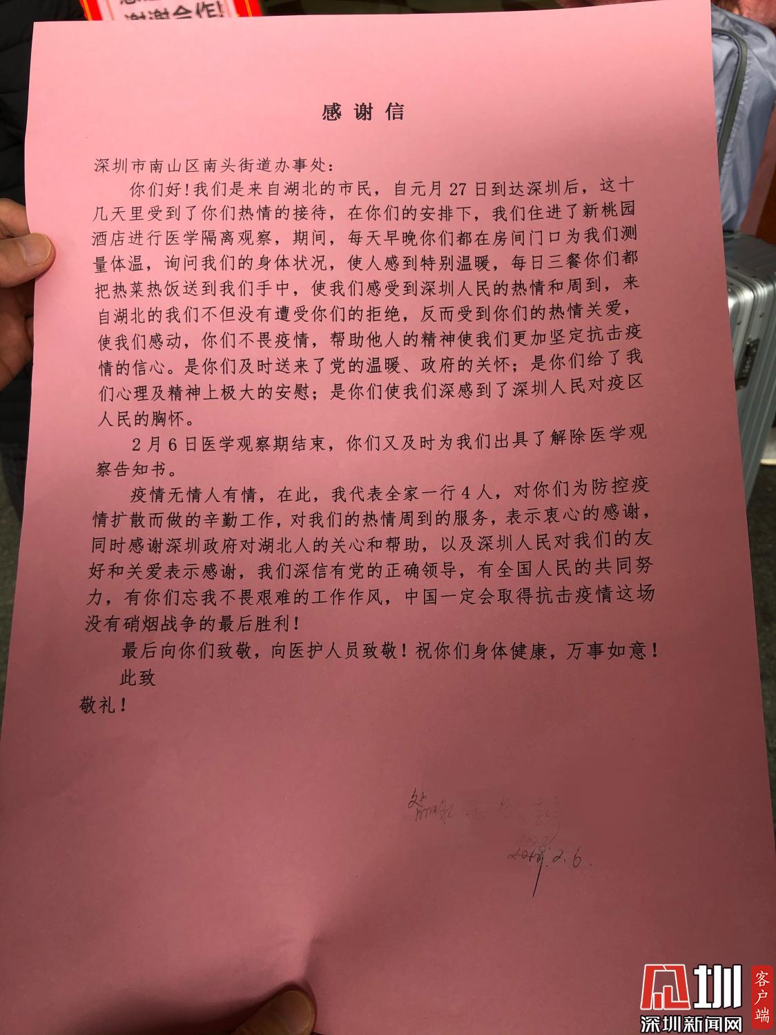 2月6日醫(yī)學(xué)觀察期滿,經(jīng)檢測他們一家并無不適癥狀,衛(wèi)健局駐點人員為其出具了解除醫(yī)學(xué)觀察告知書。李女士拉著行李滿眼淚花說道:“深圳各級政府部門高效實干,深圳的工作人員很熱心很細心,疫情猖獗時,人間自有真情在,真的感謝你們?!?/span>