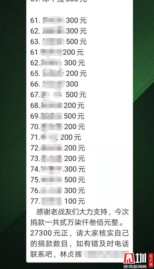 “各位戰(zhàn)友,現(xiàn)在疫情形勢(shì)如此嚴(yán)峻,正是需要我們排憂解難的時(shí)候,我們不能袖手旁觀,現(xiàn)向戰(zhàn)友們發(fā)起防護(hù)口罩捐助倡議……”早在2月2日,林貞輝便在翠竹街道退役軍人微信群里發(fā)起捐款倡議。捐款的倡議一發(fā)出,便得到熱烈響應(yīng),退役軍人們紛紛在群里接龍捐款:200元、300元、500元……微信群里的捐款數(shù)字不斷累加,不到一天的時(shí)間,便籌集到來(lái)自76位退役軍人的愛(ài)心善款27300元。