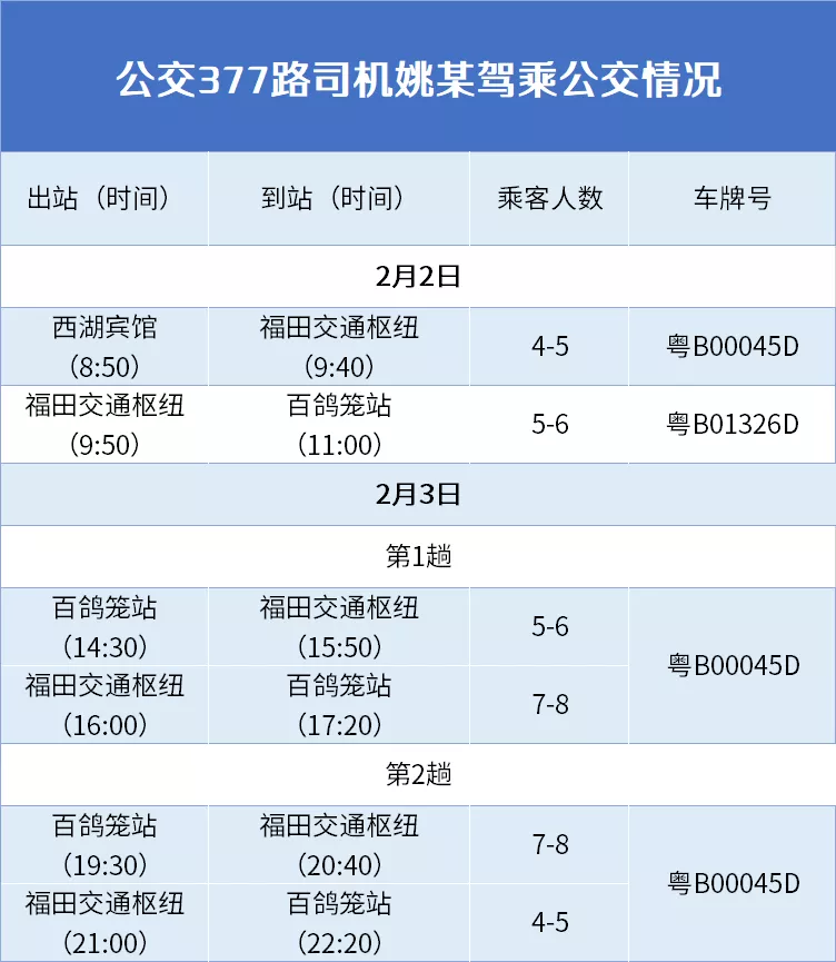 2月3日,姚某經(jīng)過崗前體溫檢測正常后,分別于14時30分至17時20分(粵B00045D)、19時30分至22時20分(粵B00045D)駕車往返白鴿籠站至福田交通樞紐兩趟,乘客共27名。期間車載視頻確認姚某佩戴口罩、車輛有出站前后消殺記錄、運行途中開窗通風(fēng)。當(dāng)晚22:20下班回家后,姚某接江西老家告知,其在老家接觸過的堂弟已確診感染新冠病毒。