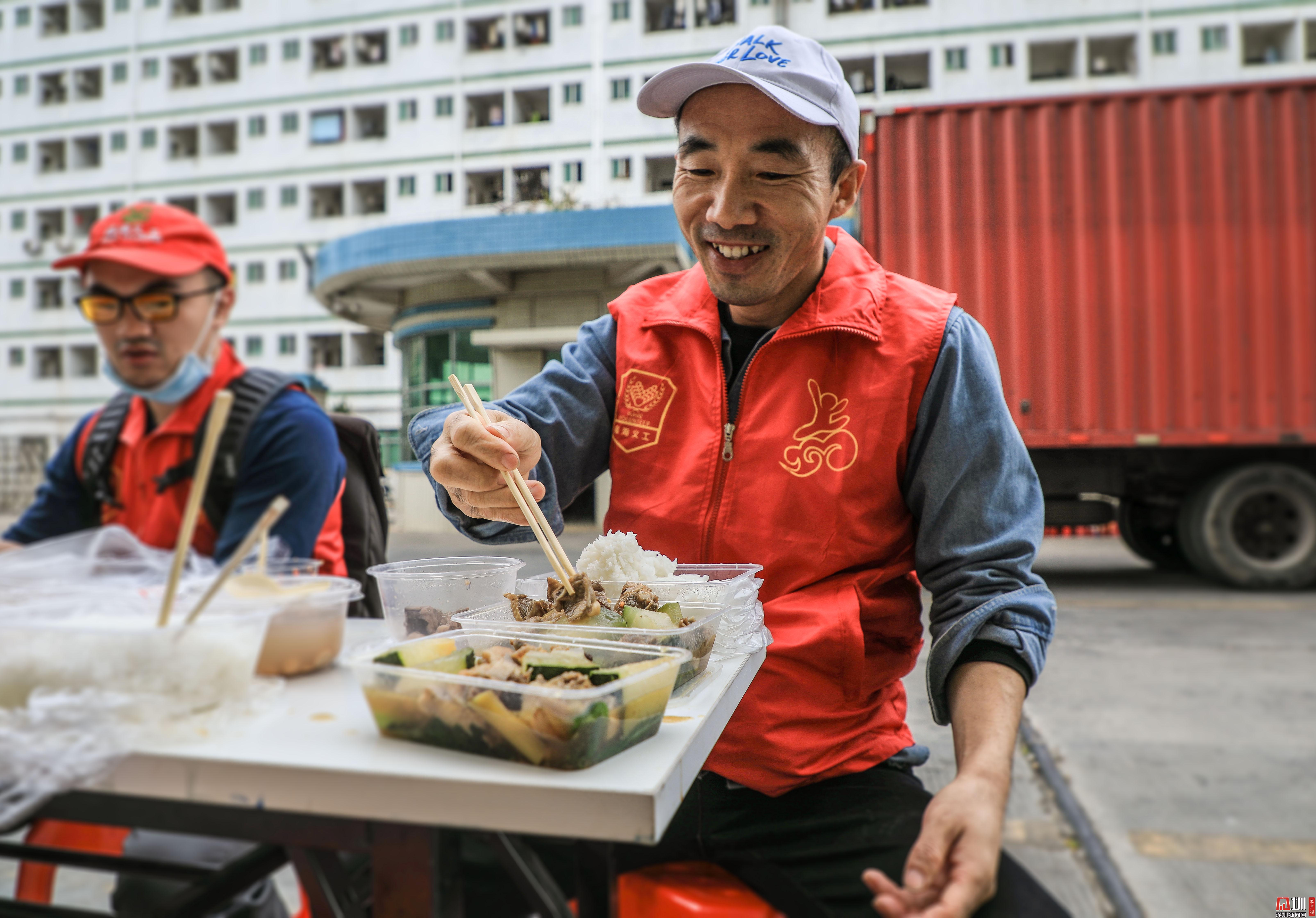 擺好桌子后,郭建庚便去排隊為義工們領(lǐng)來午餐,在工廠門口負(fù)責(zé)幫忙招工的兩位義工不能離崗,郭建庚便把午餐另外給他們送了過去。