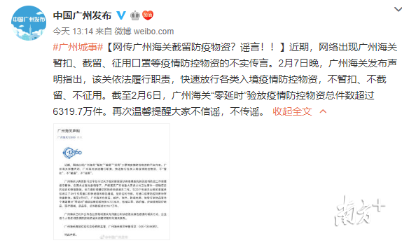 2月7日晚,廣州海關(guān)發(fā)布聲明稱,網(wǎng)絡(luò)“廣州海關(guān)暫扣、截留、征用口罩等疫情防控物資”為不實(shí)傳言。目前,廣州海關(guān)依法履行職責(zé),快速放行各類入境疫情防控物資,不暫扣、不截留、不征用。截至2月6日,廣州海關(guān)“零延時”驗(yàn)放疫情防控物資總件數(shù)超過6319.7萬件。上海、天津、寧波、大連、鄭州等地海關(guān)也紛紛辟謠,表示不會征用個人口罩。